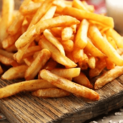 Met mini friet, kleine saté (chicken nugget, curryworst, bitterbal, boulet ) koude saus naar keuze, drank naar keuze en speelgoed.